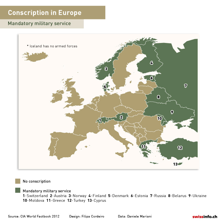 Mandatory military service has become the exception in Europe in recent years. The map shows Switzerland and Austria are at odds with most of Western Europe.