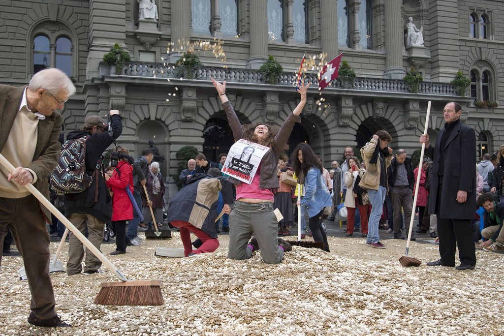 Although the initiative campaign was launched on Monday, it’s not the first time the people behind the idea have courted publicity. In October 2013, when the signatures were first handed in to parliament to secure a public vote, a mass of CHF0.05 coins were dumped onto the square in front of Switzerland’s parliament building in Bern.