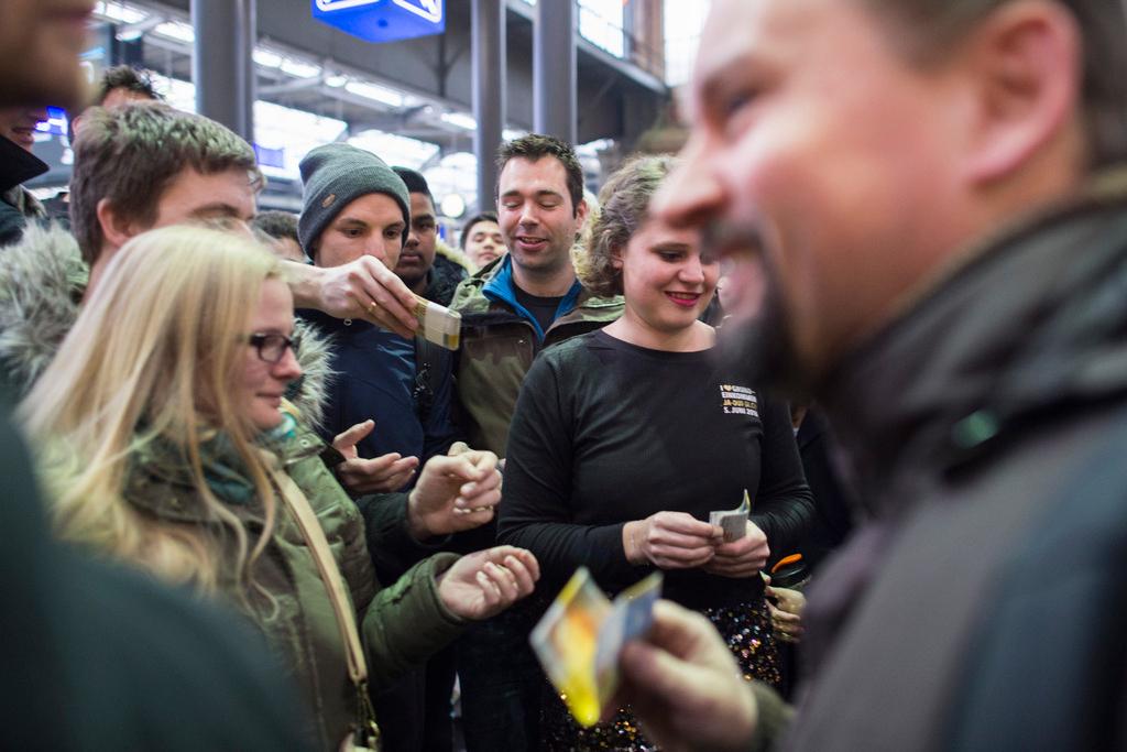 Swiss Public Television, SRF filmed the scene at the railway station as people reached out their hands for the free money. The notes had all been stamped with the name of the initiative and the date of the vote, June 5, 2016.