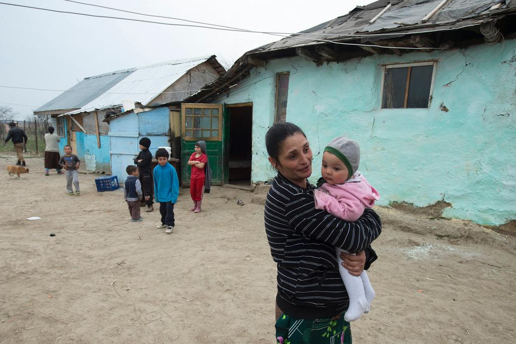 A Vizuresti, un village rom situé à 40 km au nord de Bucarest, Jonela habite une petite bicoque en ruines, sans eau potable ni chauffage. Sur le toit, des bâches en plastique; sur le sol, des matelas. Elle a 38 ans, onze enfants, et quelques dents en moins. Alors que les voisins observent avec curiosité cette visite peu commune, Jonela nous explique que sa maison retrouvera peut-être un nouvel éclat; car sa rénovation a été déclarée prioritaire dans le cadre du projet «At home in your communityLien externe», géré par différentes ONG et financé par la Suisse à hauteur de 165’000 francs. Son objectif est d’améliorer les conditions de vie de la communauté, mais surtout de la renforcer afin qu’elle prenne en main son propre destin.