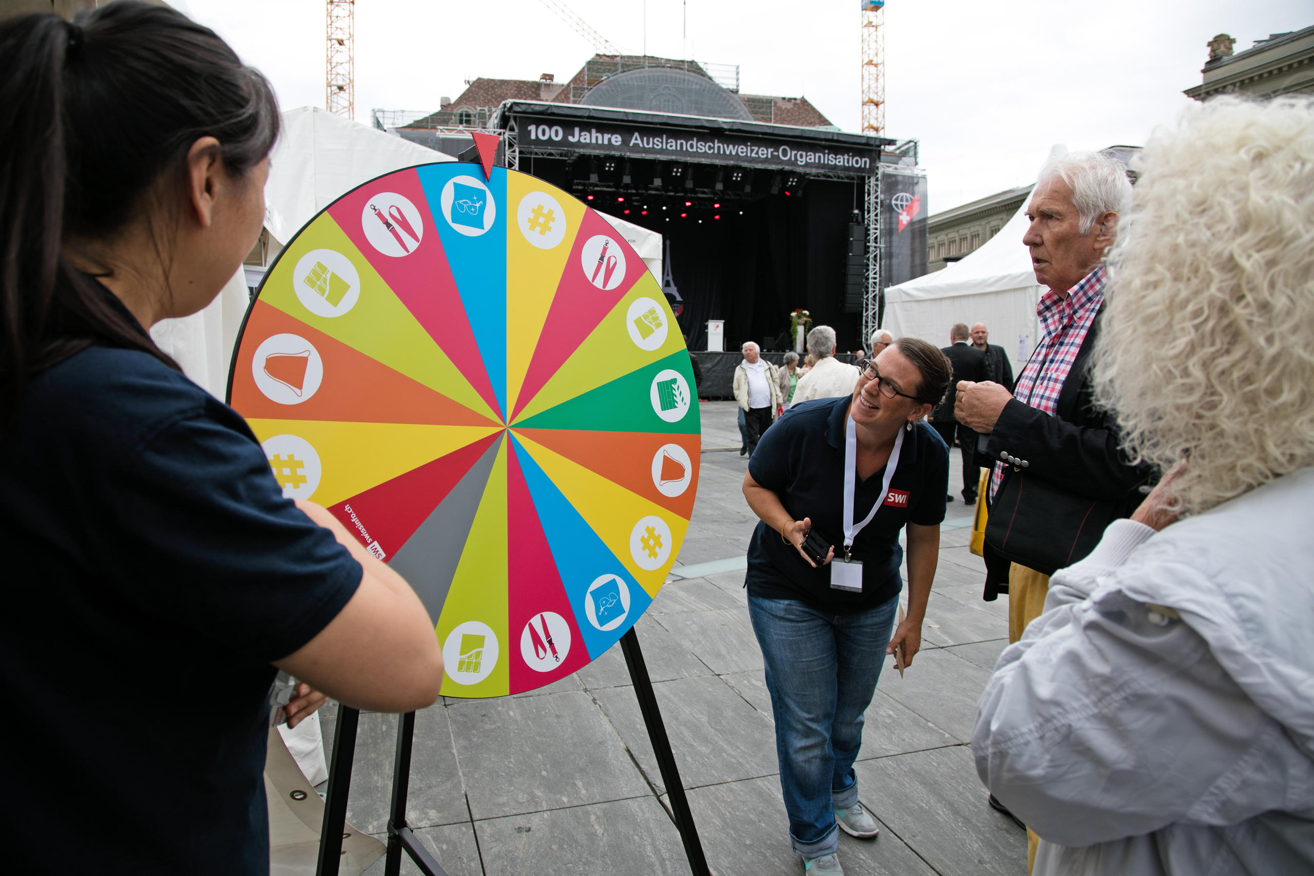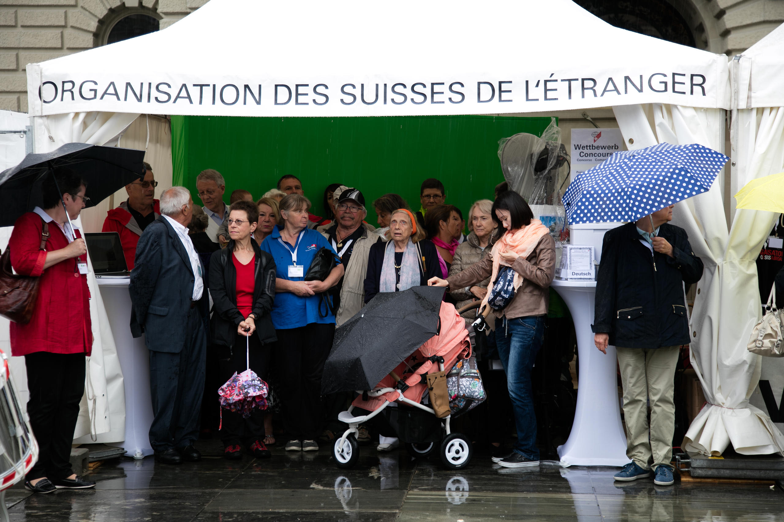 Les Suisses de l’étranger ont investi la Place fédérale vendredi à l’occasion du jubilé de leur organisation faîtière. Une météo défavorable n’a pas entaché leur bonne humeur, même si le parapluie était de mise et qu’à défaut, il fallait souvent trouver refuge sous une tente ou sous le premier avant-toit venu.