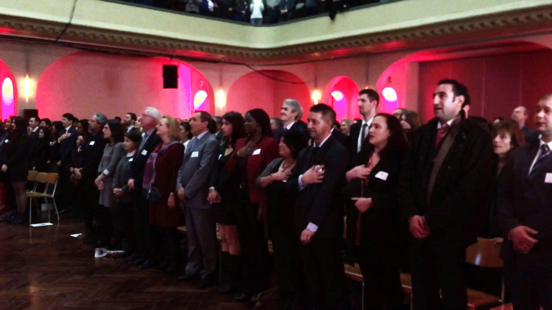 呼ばれた人は一人ずつ立ち上がり、手を挙げて「誓います」、「約束します」と宣言する。涙を拭う人もいる。それから最後の試練である国歌斉唱がある。カラオケの字幕が助けてくれる。