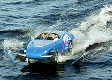 But at the push of a button, the car’s concealed hydraulic mechanism allows the vehicle to drive off the road and into the water.