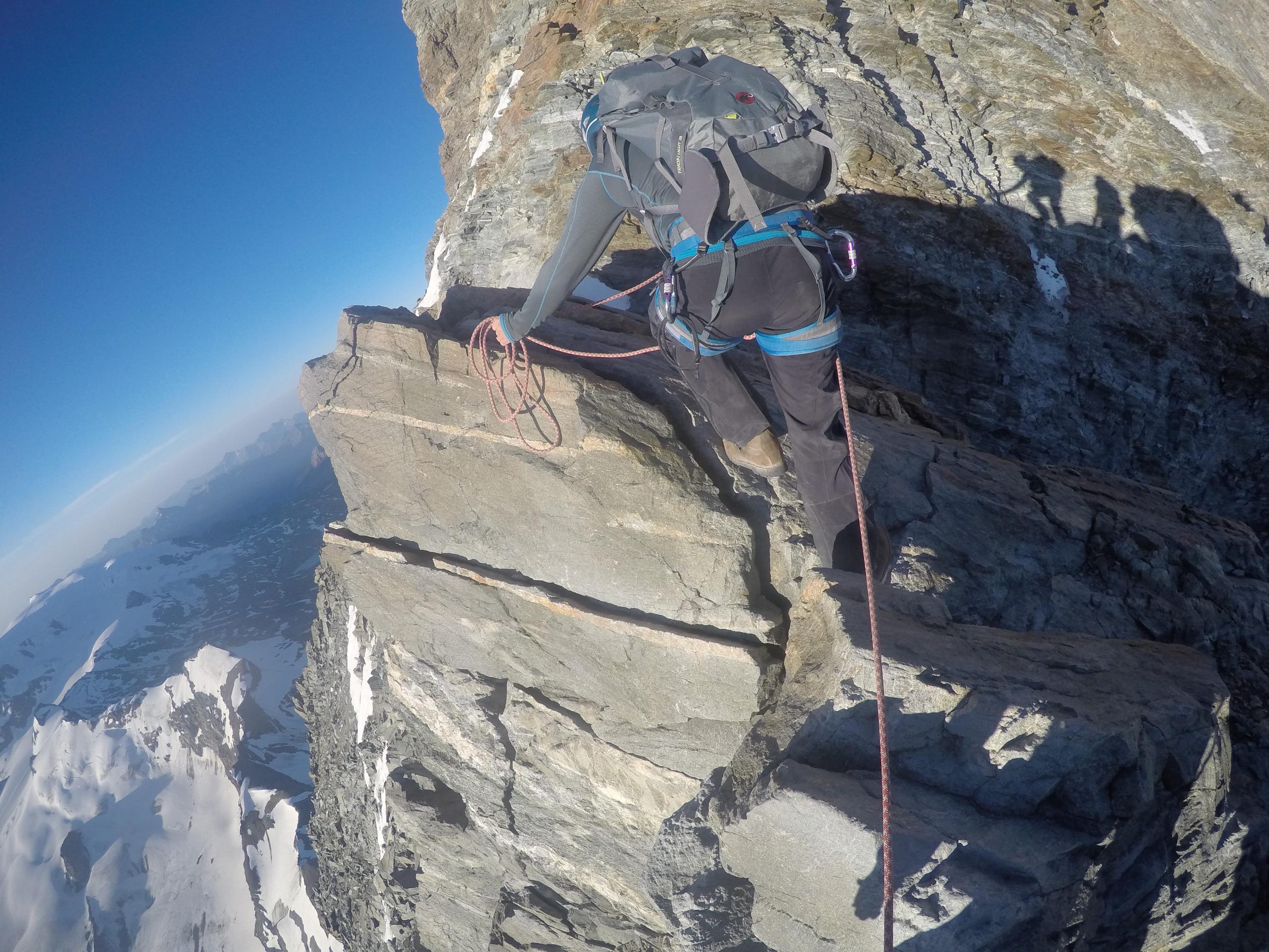 Until we reached the narrow summit ridge, I had been thinking that would be the scariest part. I’d watched GoPro videos and worried about having to walk the equivalent of a balance beam of rock and snow above a drop of thousands of metres on both sides. But by then I’d gotten my groove back. I had my own GoPro helmet camera, first time for me, and I had been more or less precisely following Gianni’s boot heels for hours. He also had me on a tight leash of rope.