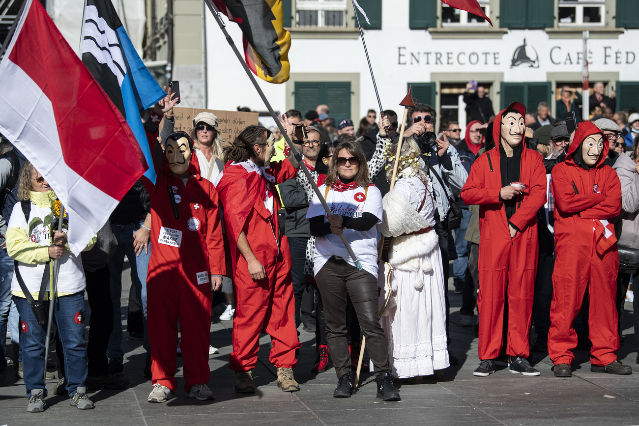 On Saturday afternoon, protestors filled the square in front of the parliament building chanting “freedom” and ringing bells. According to Keystone-SDA, there were no notable incidents with police, who were patrolling the area. A few hundred people, mostly young people, gathered a few hundred metres away for a counter demonstration.
