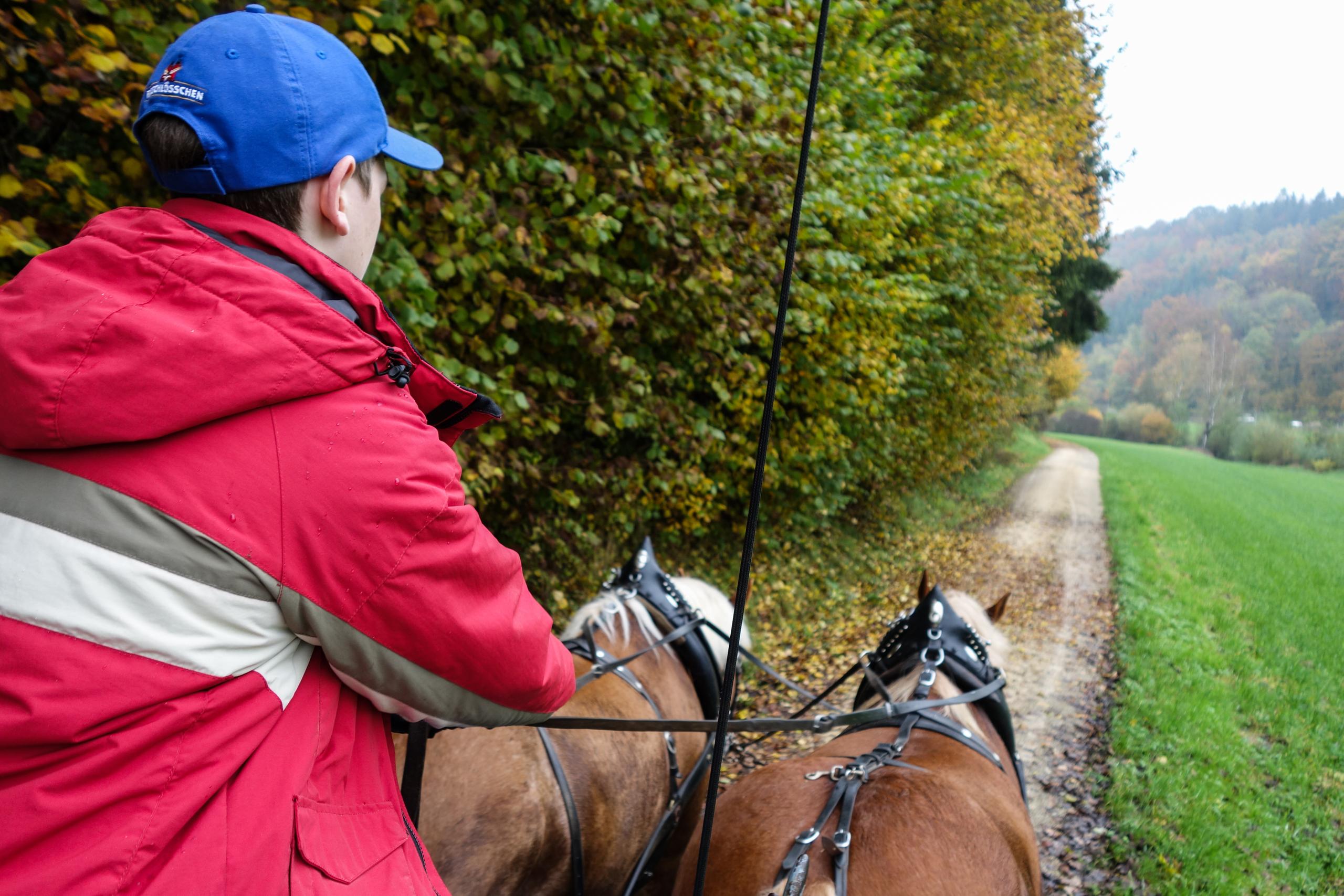 I ask David how he feels the lessons are going. “Now I feel good with the two horses in front of me that I can drive. It’s a good feeling,” he says. Then the road dips downhill, and David needs to concentrate on braking. Luckily, the horses don’t seem too eager to run off, and we can admire the quiet beauty of the forest.