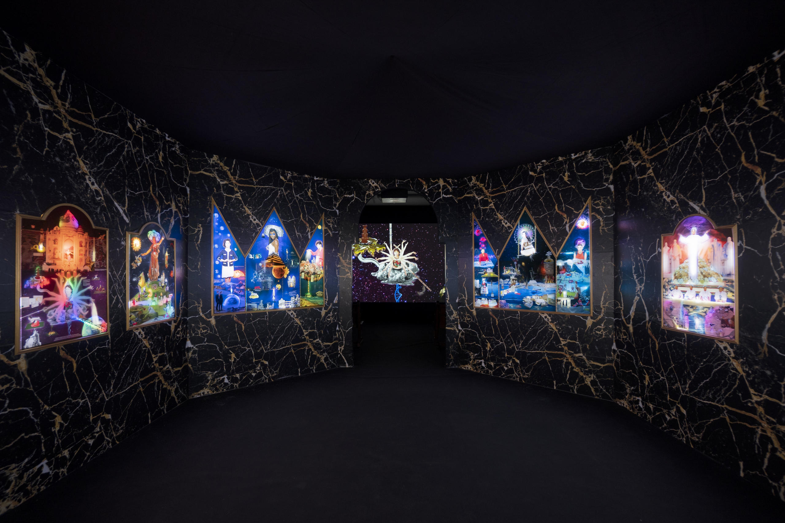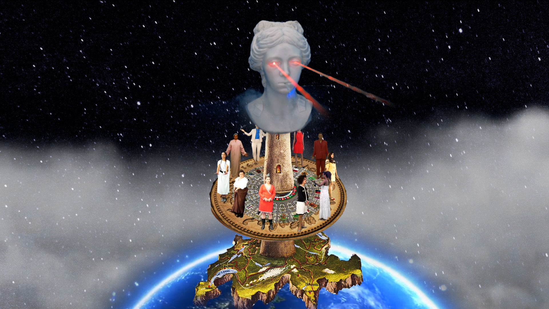Born in Geneva and raised in Paris, Grenoble, Brussels and Rio de Janeiro, Guerreiro do Divino Amor is known for his audiovisual and graphic installations. In them, all kings, queens and subjects are always naked. The artist creates parallel worlds, linked by bridges of attraction and repulsion, based on both utopian and dystopian images. Guerreiro do Divino Amor thus represents what he calls his “superfictional allegories”, or “institutional science fiction universes”: the artist on a tightrope between the present and the future of all his six fluent languages.
