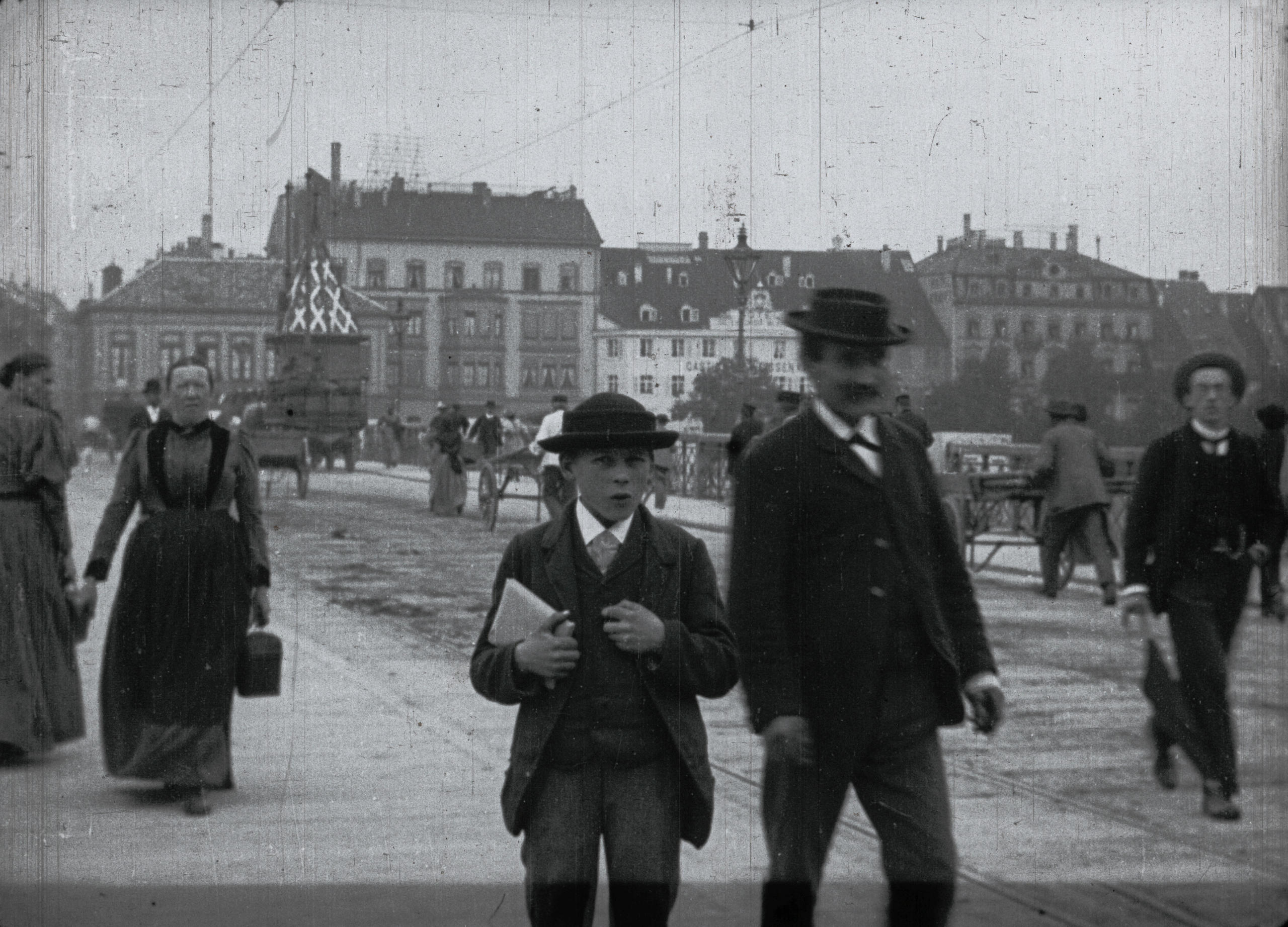 Despite the weather, Girel’s cinematograph had more or less captured what his employer wanted. What catches your eye as you watch the result? The slightly lost-looking paperboy at the beginning? The curious and unsure reactions? The mysterious moustachioed smoker who barely moves? The clothes? Possibly one of the world’s first product placements (for the Basel Löwenbräu brewery)?