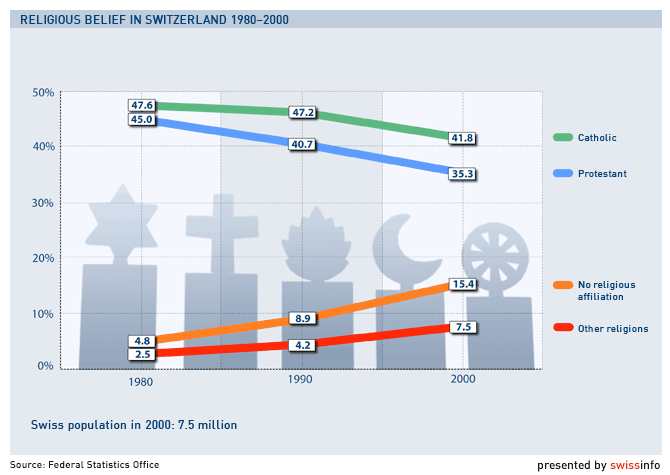 Switzerland’s Christian population and its national churches has seen the number of members dwindle over the past decade, while the influx of immigrants has led to an increase of Muslims. There is also an increase in the number of people with no religious affiliation, and non-denominational “free” churches are thriving, according to researchers.