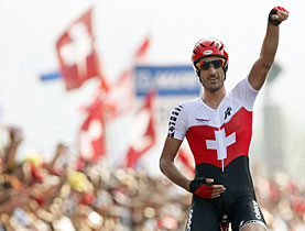He began celebrating long before the finish line, applauding his fans and patting the Swiss flag on his jersey.