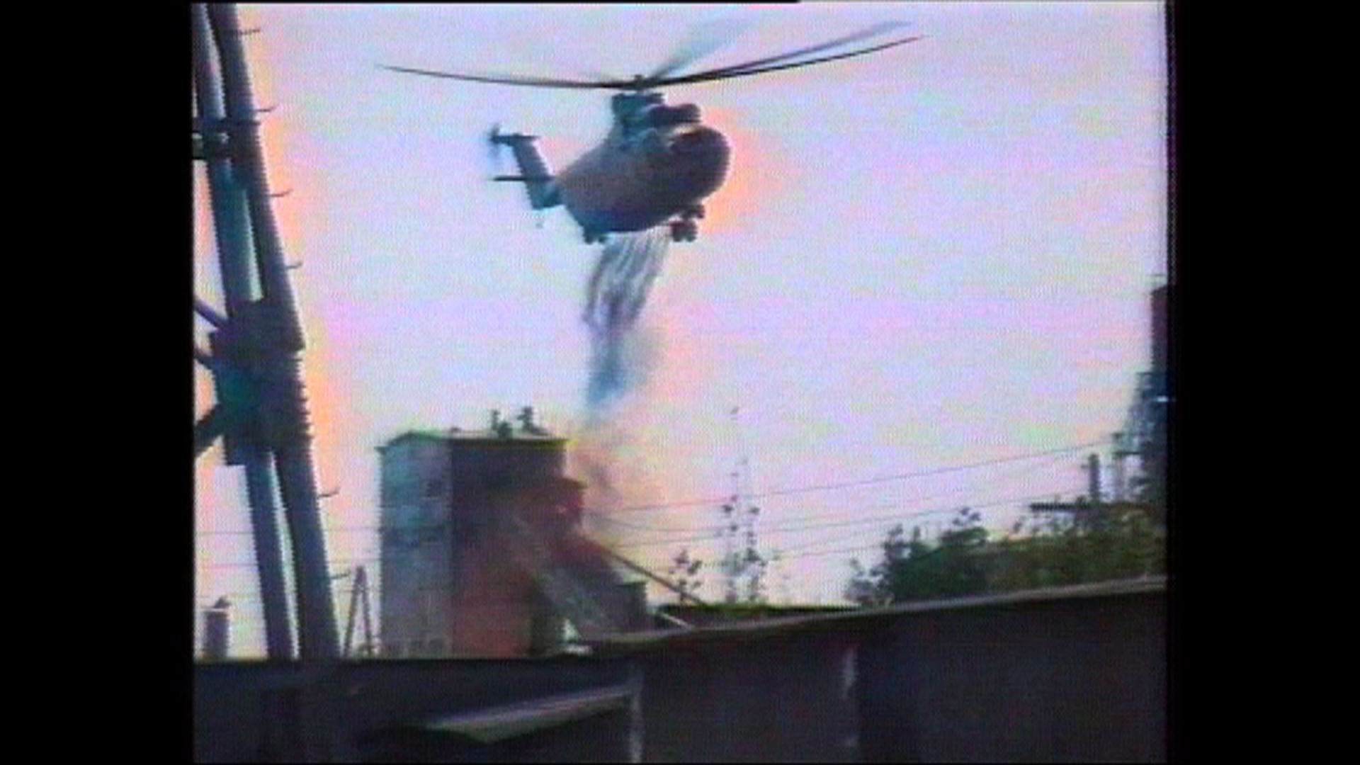 Arriving at the ruined reactor with its enormous, hastily constructed concrete cover, we see cranes moving to and fro as welders race against time to shore up the metal supports of the structure, which threaten to collapse at any moment. Radiation from 200 tons of nuclear waste stored here has begun to seep through fissures in the sarcophagus.