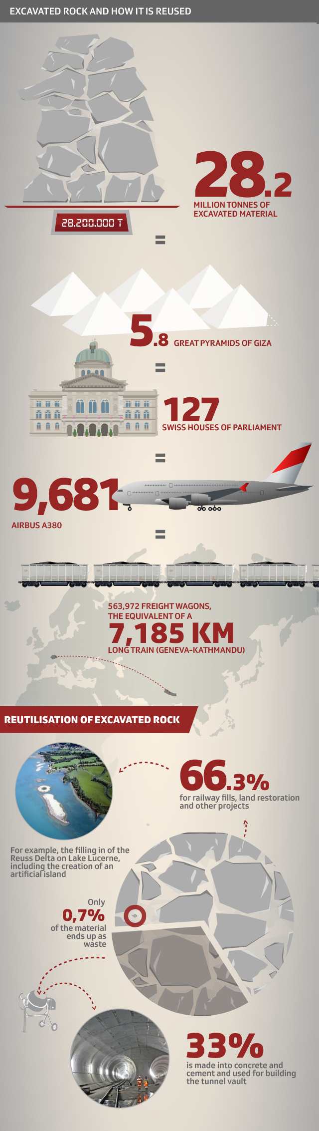 More than 28 million tonnes of rock has been shifted to make the Gotthard Base Tunnel – the same amount of material needed to make six Great Pyramids of Giza. But the Swiss have instead used the material for various projects, including artificial islands.