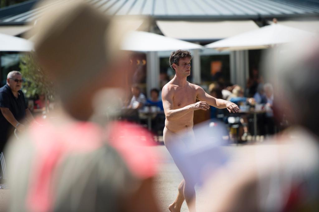 “I think it’s funny!” laughs a woman in her 80s, standing by watching nude dancer, Foofwa d’Imobilité, as he moves fluidly around a large paved square. “But is he allowed to do that?”