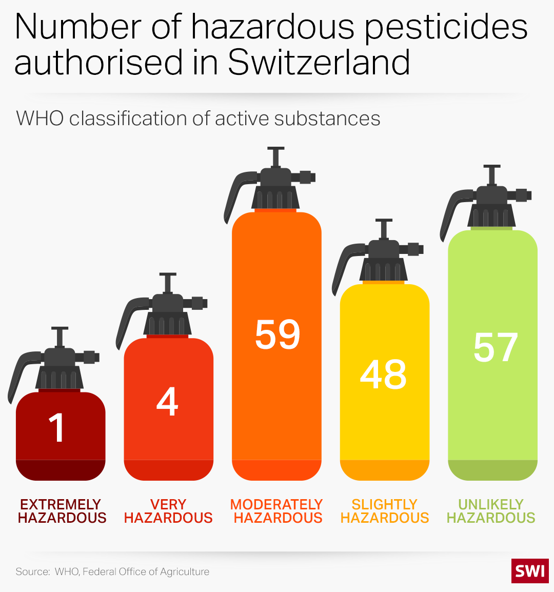 Switzerland may be “average with room for improvement” in a global context, but what does that mean for its population? The toxicity profiles of pesticides fall on a wide spectrum and the World Health Organization (WHO) has recently classified them on their potential to do harm to humans. When we cross-referenced the WHO hazard classification against a list of 360 active substances approved in Switzerland, we found 170 matches. The analysis revealed the presence of a pesticide that the WHO classifies as “extremely hazardous”: the active agent bromadiolone, sold in Switzerland under the trade name Arvicolon 200 CT. It is used in baits to kill a rodent called water vole that is considered a pest in horticulture and viticulture. Four substances fell into the “highly hazardous” category (abamectin, methomyl, tefluthrin, zeta-cypermethrin) while about a hundred others were classified as “moderately hazardous” and “slightly hazardous”.