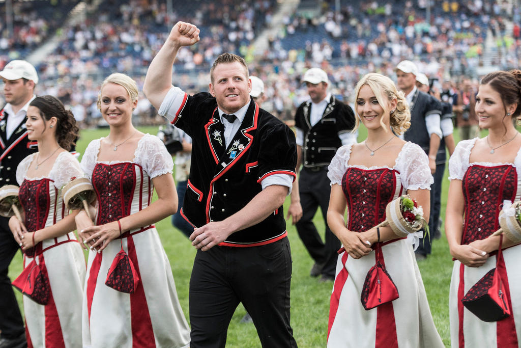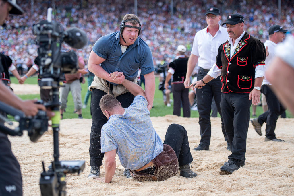 As the ads say, a Swiss king isn’t crowned – he has to fight for it. And so it was that the 30-year-old GlarnerExternal link, a 114-kilogram (251 pounds) bear of a man from the community of Heimberg, near Lake Thun, won the championship title in Swiss wrestling, the national sport known as “schwingen”.
