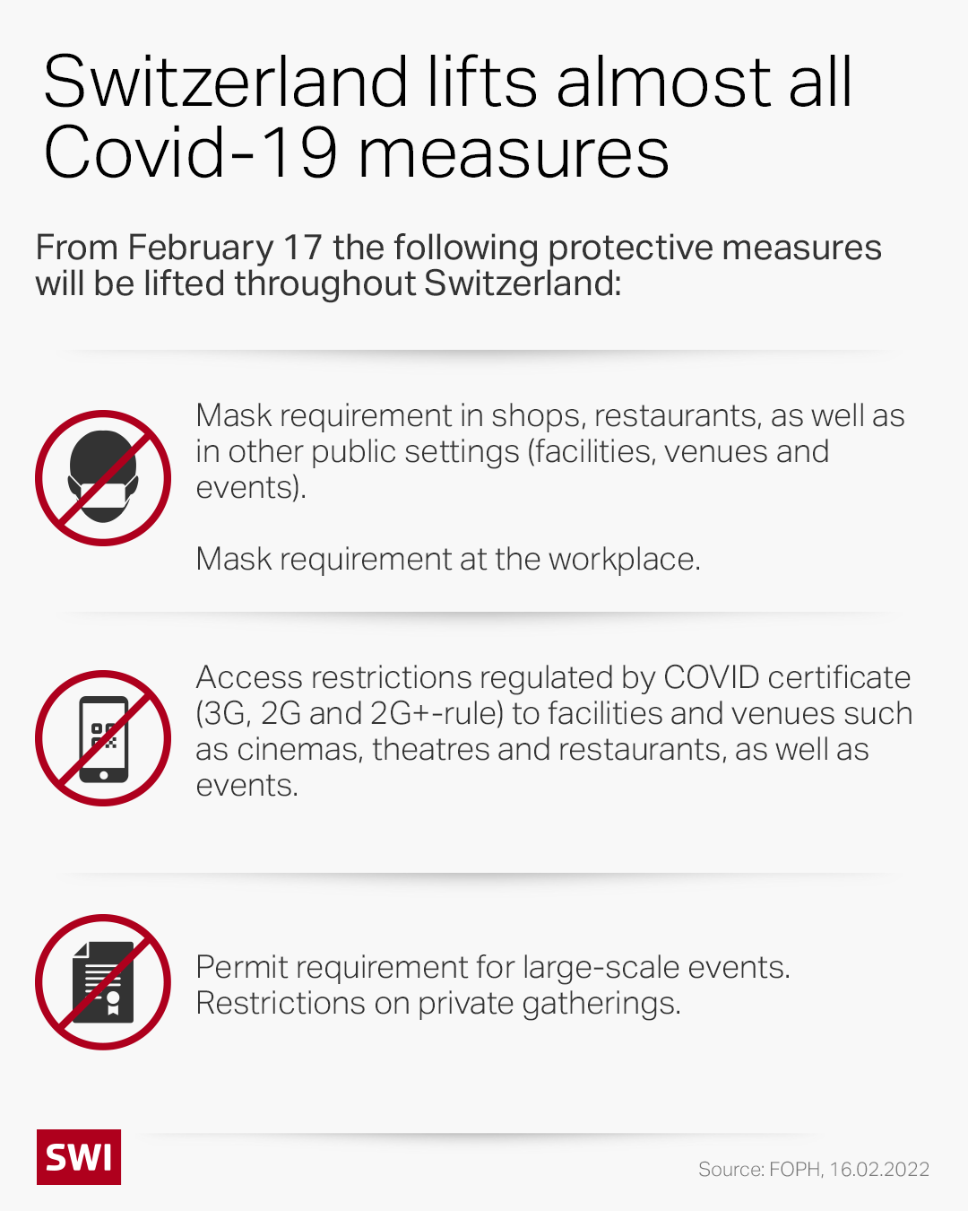 Wednesday’s decision follows consultations with the cantons, parliament and relevant organisations, all of which supported the immediate lifting of restrictions while keeping the mask requirement for special circumstances. The cantons still have the possibility of introducing stricter measures if necessary.