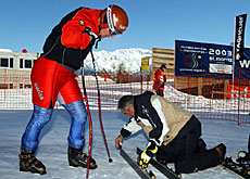 Edi Waldburger (à droite) prépare les skis de Bruno Kernen, à Saint-Moritz. Keystone