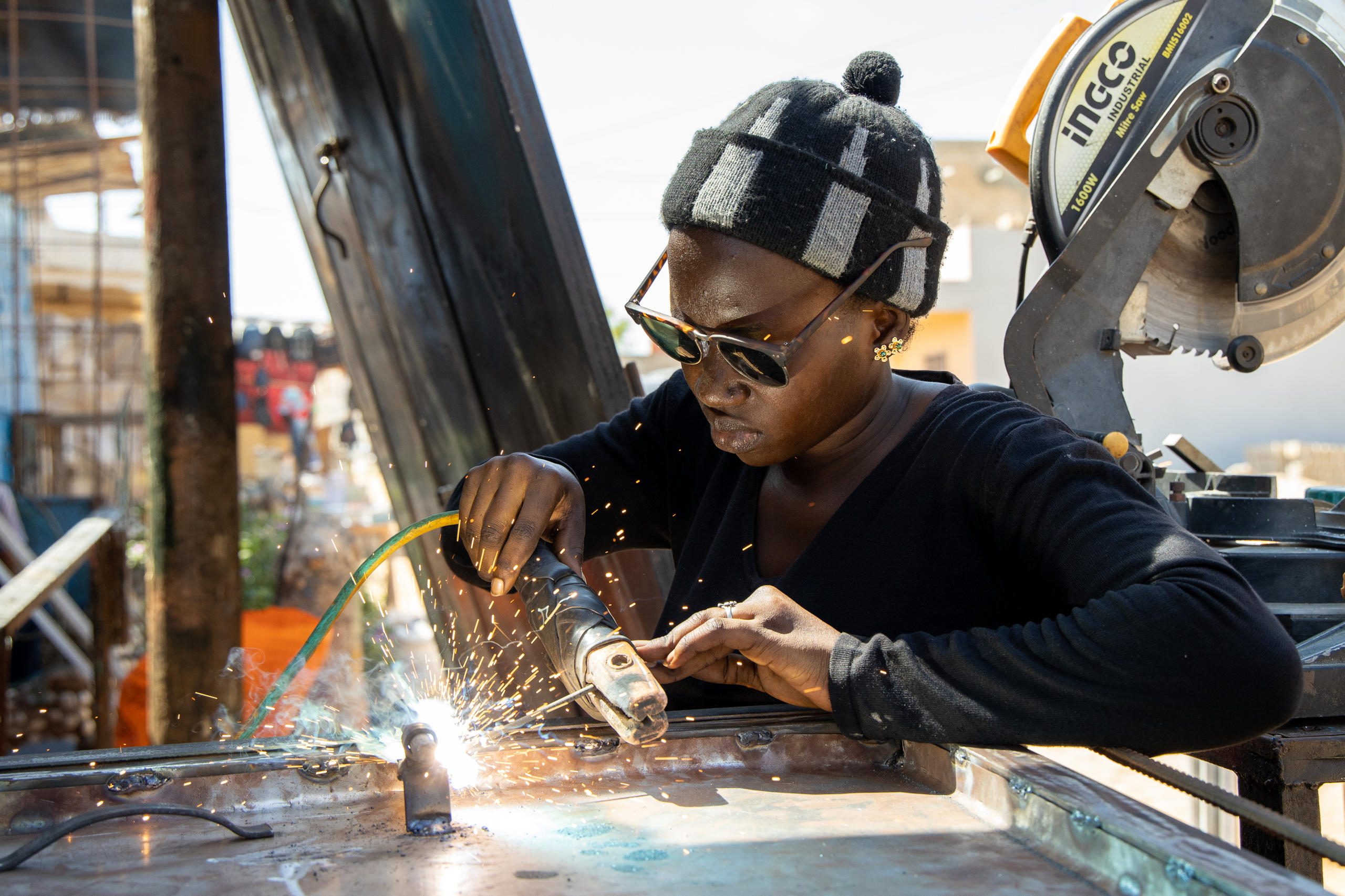 Vor einer Metallbauwerkstatt hämmern Jugendliche auf einer Werkbank an einem Aluminiumtor herum. Unter ihnen eine junge Frau, die 17-jährige Mariam. Die Gruppe macht eine Lehre bei der senegalesischen Nichtregierungs-Organisation (NGO) Alphadev.