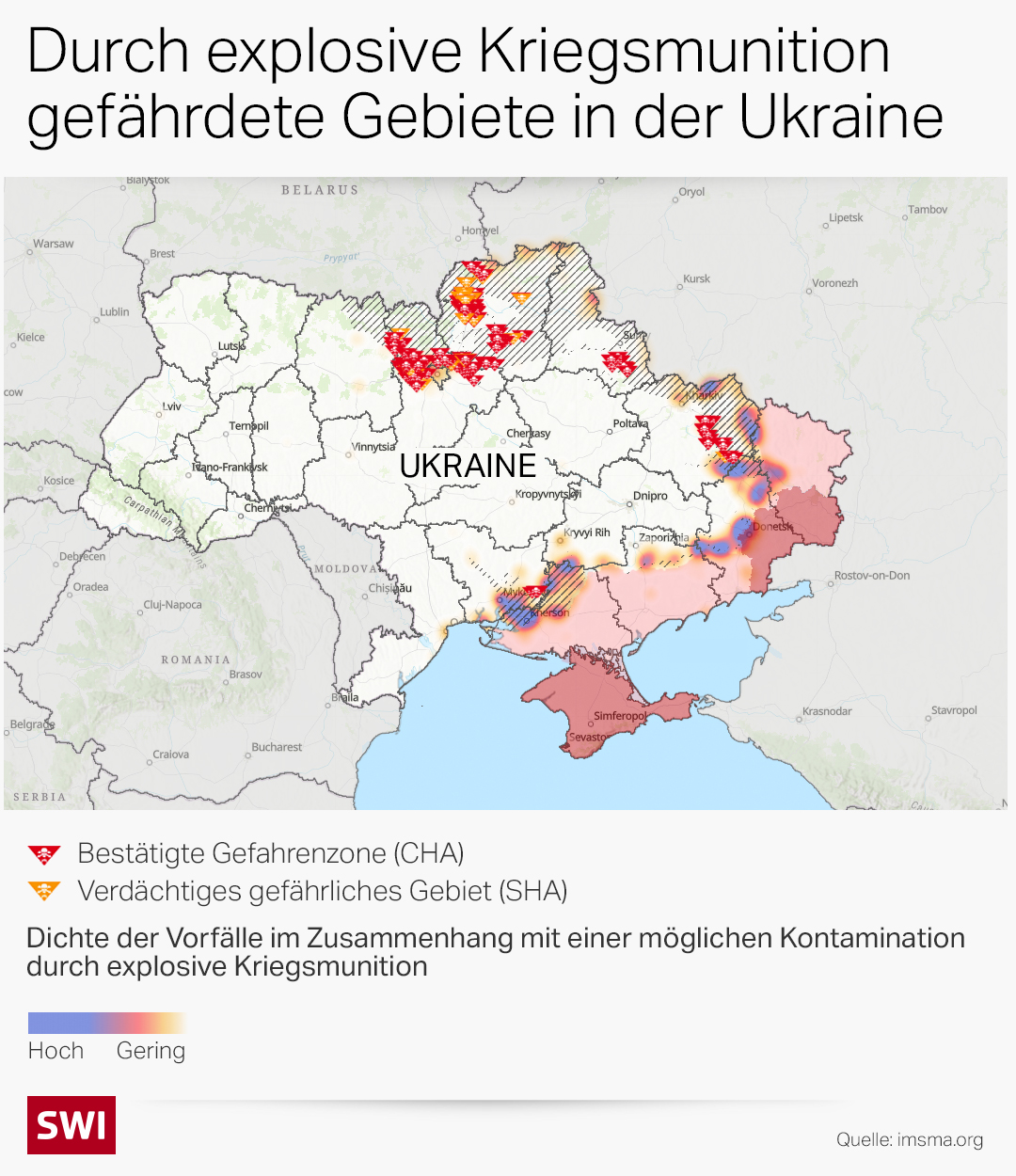 Antipersonen- und -fahrzeugminen, Streumunition sowie andere nicht explodierte oder zurückgelassene Munition liegen verstreut in Städten, auf Ackerland und Seewegen. Es wird geschätzt, dass bis zu 30% Prozent der Ukraine vermint sind – eine Fläche, die etwa doppelt so gross ist wie Österreich.