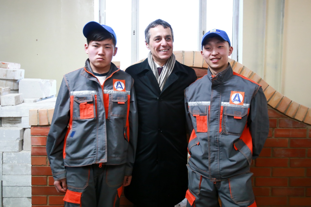 Ignazio Cassis und zwei mongolische Lehrlinge