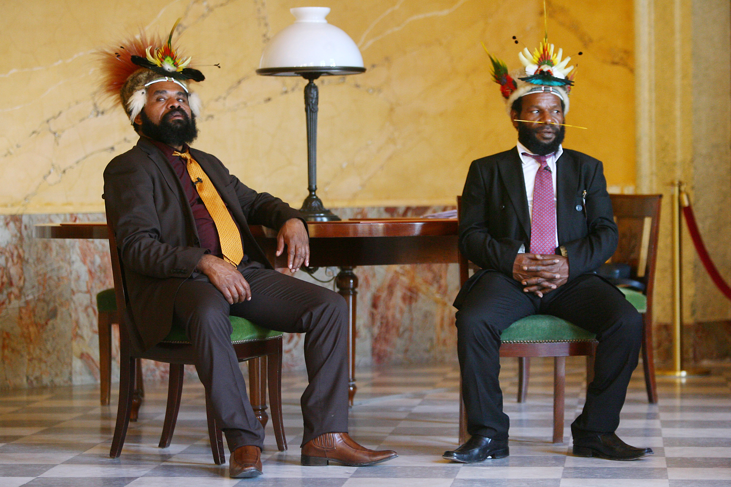 Il "signore della guerra" Mudeya Kepanga (a destra) e il "signore della pace" Polobi Palia, entrambi della Papua Nuova Guinea, durante una visita a Parigi (2006). Conflitto: Papua Nuova Guinea (violenze tribali); Inizio: 1975; Motivi: predominio regionale e accesso alle risorse; Parti: diverse tribù dell'altopiano.