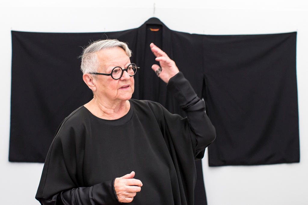 バーゼル出身のドゥ・カルージュさんは黒い服をデザインすることで知られる。1983年に初の単独コレクションを開催。全て黒い服によるコレクションは当時、国内で例がなく演劇のような表現方法も大きな注目を浴びた。