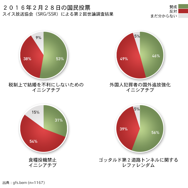 2月28日の国民投票にかけられる四つの案件について、スイス放送協会(SRG/SSR)が2回目の世論調査を行った。今回の世論調査では、税制上で結婚を不利にしないためのイニシアチブ(国民発議)と、ゴッタルド第2道路トンネルに関する議会の決議に対するレファレンダムにおいて賛成派が過半数を超えた。一方で、食糧投機禁止イニシアチブでは反対多数、外国人犯罪者の国外追放強化案では反対がわずかに3%賛成を上回った。