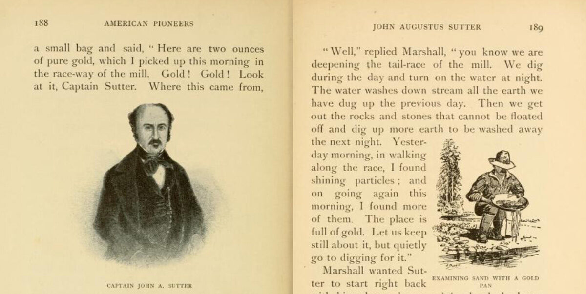 Martin Birmann (1828-1890), tutor da mulher de Sutter, que havia caído na pobreza, escreveu em 1868, portanto antes da morte de Sutter, um pequeno livro, que foi publicado em Basileia. Nesta obra, ele resumiu a vida de Sutter. Afinal, quando se conhece o homem em cuja propriedade deu origem à famosa corrida do ouro, por que não tirar partido de sua fama? No entanto, Birmann embeleza consideravelmente a história de Sutter. E é esse relato embelezado do pioneiro dos Estados Unidos que ainda hoje é adotado e difundido.
