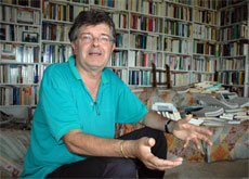 – Com relação aos livros, tenho um comportamento pouco condizente com o decrescimento – reconhece. Para receber o jornalista de swissinfo, ele abre um espaço no meios dos papéis espalhados em cima do sofá, convida para sentar e traz um café.