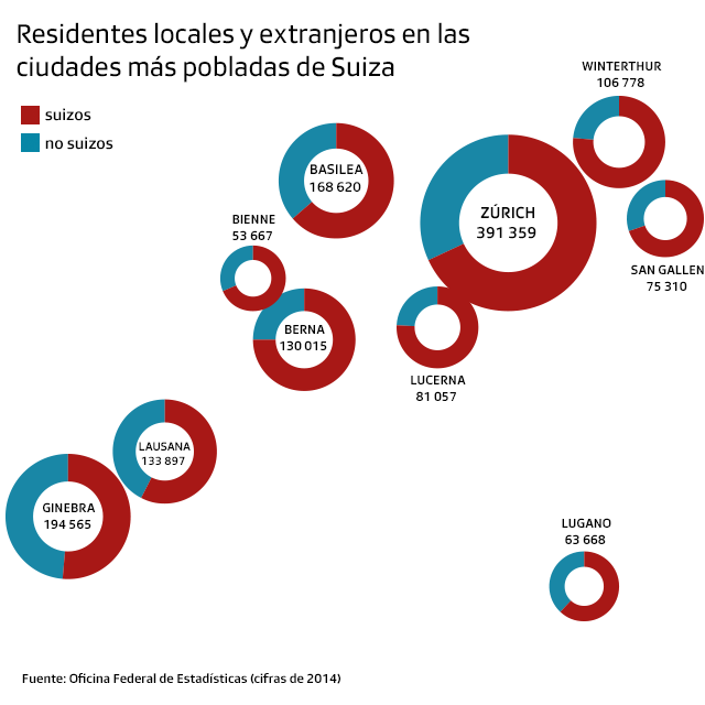 Diez ciudades de Suiza tienen más de 50 000 habitantes. La mayoría son “locales” y el porcentaje de residentes sin pasaporte helvético varía considerablemente: desde 23,4% en Winterthur hasta 48,4% en Ginebra.
