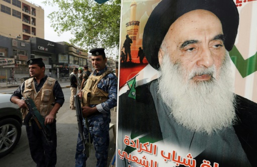 عناصر من قوات الامن العراقية يقفون قرب ملصق عليه صورة آية الله علي السيستاني في حي الكرادة ببغداد في 21 تشرين الاول/اكتوبر 2015 afp_tickers