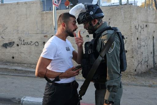 صورة أرشيفية التقطت في 15 ايار/مايو 2021 خلال فعاليات احياء الفلسطينيين ذكرى النكبة بعد تأسيس دولة إسرائيل في العام 1948 ويظهر فيها شاب فلسطيني يجادل أحد عناصر قوات الأمن الإسرائيلية في حي الشيخ جراح في القدس الشرقية المحتلة حيث يتهدد خطر الإجلاء عدد من العائلات الفلسطينية لصالح الجمعيات الاستيطانية afp_tickers