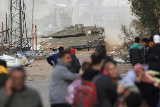 مدرعة إسرائيلية تمر أمام فلسطينيين فارين من القتال في غزة في حيّ الزيتون بجنوب القطاع في 19 تشرين الثاني/نوفمبر 2023 afp_tickers