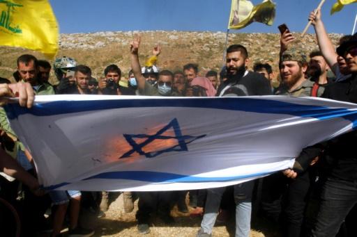 أنصار حزب الله يحرقون العلم الإسرائيلي في منطقة الخيام الحدودية في جنوب لبنان بتاريخ 25 أيار/مايو 2021 afp_tickers