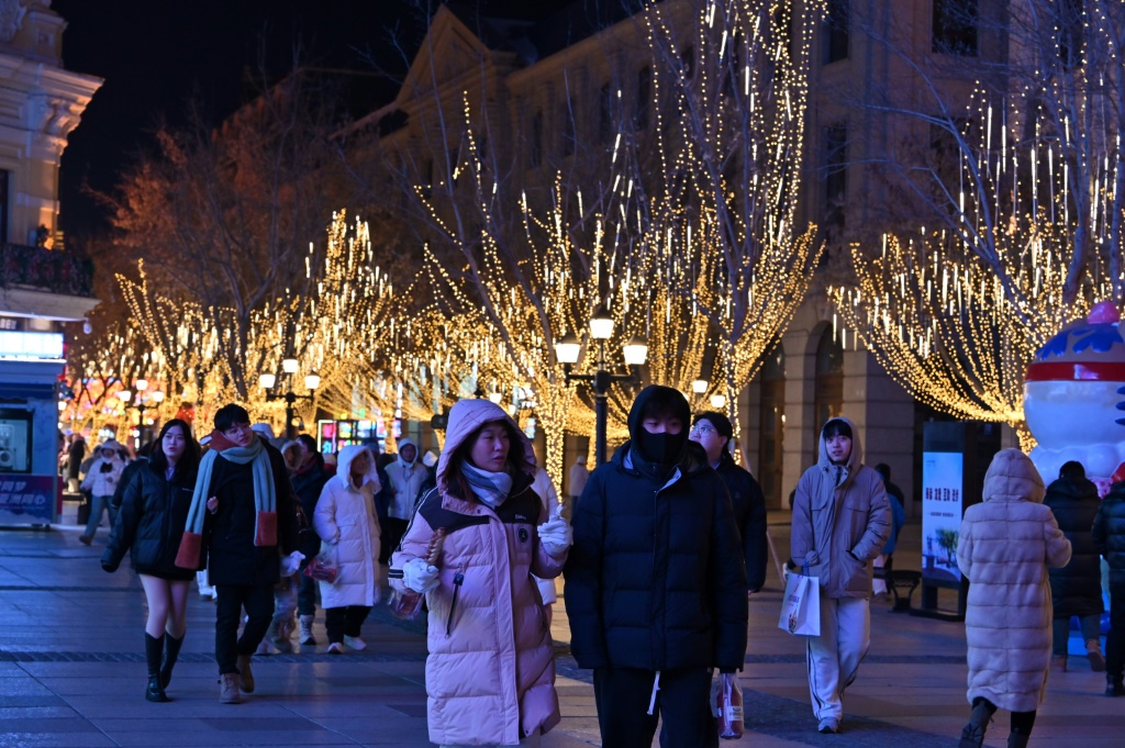 في مساء هذا اليوم من كانون الأول/ديسمبر، تتجوّل مجموعات من الزوار تحت الأضواء الصفراء لشارع التسوق الشهير في مدينة هاربين.