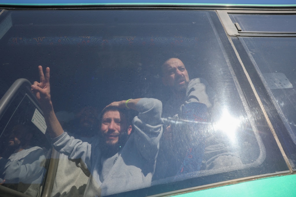 ورفع أحدهم إشارة النصر من داخل باص يحمل شعار الصليب الأحمر، بينما كانت الدموع تنزل على وجنتيه، وأخرج آخر علم فلسطين من نافذة حافلة.