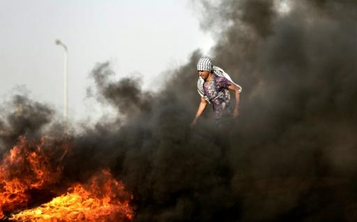 متظاهر فلسطيني بين اطارات مشتعلة خلال مواجهات على حدود قطاع غزة مع اسرائيل في 18 ايار/مايو 2018 afp_tickers