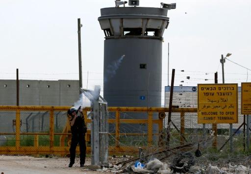جندي اسرائيلي يطلق عبوة غاز مسيل للدموع على متظاهرين فلسطينيين امام سجن عوفر قرب بيتونيا بالضفة الغربية في 30 آذار/مارس 2016 afp_tickers