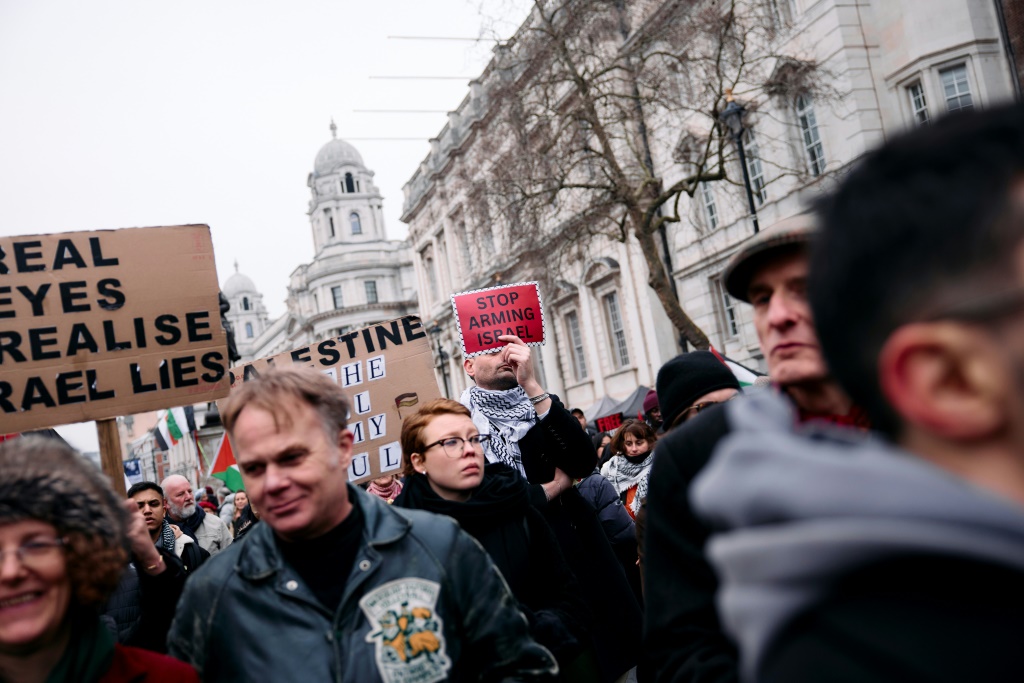 وتحولت المسيرة إلى تجمع ثابت في وايت هول، الشارع الرئيسي في حي يضم مقار أبرز الوزارات، بعد أن رفضت الشرطة المسار الذي اقترحته “حملة التضامن مع فلسطين” Palestine Solidarity Campaign والذي كان يمر بمحاذاة كنيس يهودي.