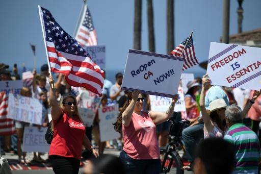 تظاهر الآلاف الجمعة في كاليفورنيا للمطالبة برفع الحجْر الساري منذ ستّة أسابيع، حاملين أعلام الولايات المتّحدة ولافتات، ومرتدين قبّعات كُتبت على بعضها رسائل مؤيّدة للرئيس دونالد ترامب.