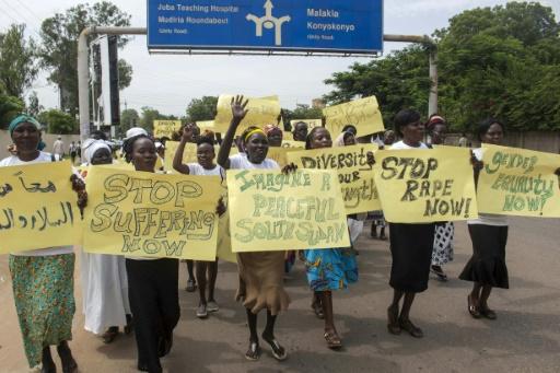 نساء يتظاهرن مطالبات بالسلام وبحقوقهن في جوبا عاصمة جنوب السودان في 13 تموز/يوليو 2018 بعد انباء عن هجمات همجية على المدنيين نفذتها قوات حكومية وقوات حليفة لها وقد ترقى الى جرائم الحرب وفق الامم المتحدة afp_tickers