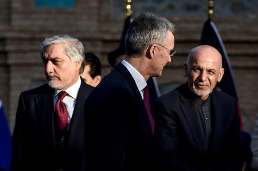الرئيس الأفغاني أشرغ غني (يمين) وخصمه عبدالله عبدالله يتوسطهما الأمين العام لحلف الأطلسي ينس ستولتنبرغ في كابول بتاريخ 29 شباط/فبراير 2020 afp_tickers
