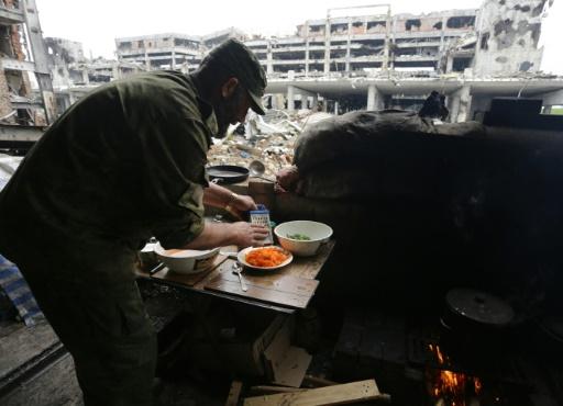 مقاتل من الانفصاليين يعد طعاما في موقعه في مطار دونيتسك 1 يونيو 2016 afp_tickers