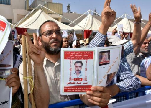 متظاهرون أمام محكمة في قابس في 29 أيار/مايو 2018 يطالبون بالعدالة لمعارض قتل خلال عهد الرئيس زين العابدين بن علي afp_tickers