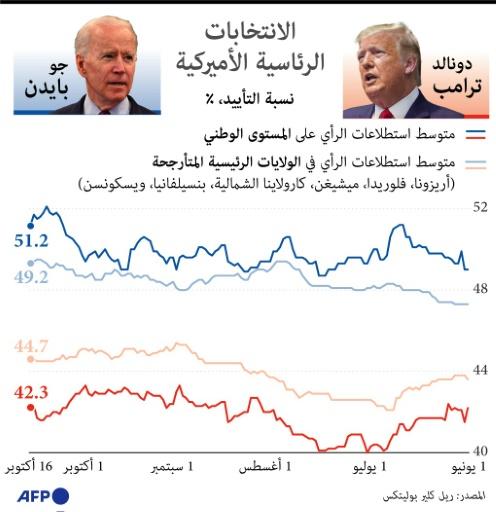 لكن إذا صحت الاستطلاعات، يبدو بايدن في وضع أفضل في هذا الصدد، على الرغم من أنه أحيانا ضمن هامش الخطأ، ويتراوح تقدمه بفارق يبلغ ما بين 1,7 نقطة مئوية في فلوريدا إلى 7,2 في ميشيغان.
