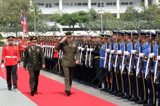 الجنرال جو دانفورد رئيس هيئة الاركان الاميركية(وسط) يستعرض حرس الشرف التايلاندي مع نظيره التايلاندي تارنشيان سريسوان في بانكوك في 7 شباط/فبراير 2018. afp_tickers