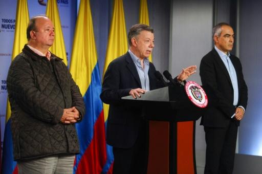 صورة نشرتها الرئاسة الكولومبية للرئيس خوان مانويل دوس سانتوس (وسط) ووزير الدفاع لويس كارلوس فييغاس (يسار) ومفوض السلام رودريغو ريبيرا خلال المؤتمر الصحافي الذي اعلن خلاله عن وقف اطلاق النار مع حركة التمرد "جيش التحرير الوطني"، في 29 ايلول/سبتمبر 2017 afp_tickers