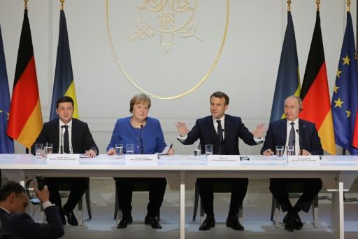 الرئيس الروسي فلاديمير بوتين (الأول من اليسار) والرئيس الفرنسي إيمانويل ماكرون والمستشارة الألمانية أنغيلا ميركل والرئيس الأوكراني فولوديمير زيلينسكي في قصر الاليزيه في باريس في 9 كانون الأول/ديسمبر 2019 afp_tickers