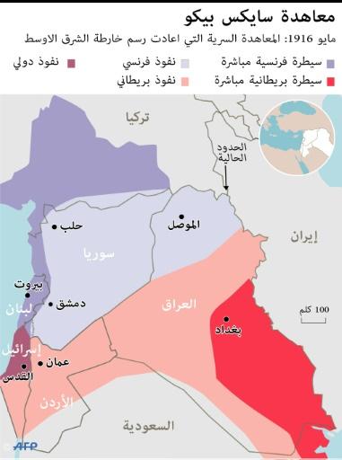 في 16 ايار/مايو 1916، مع وشوك هزيمة المانيا وحليفها العثماني في الحرب العالمية الاولى ابرم الدبلوماسيان مارك سايكس وفرنسوا جورج بيكو معاهدة تقاسم البريطانيون والفرنسيون بموجبها السيطرة والنفوذ في مناطق انحسار السلطة العثمانية، وفق خطوط شكلت الى حد كبير حدود الدول الحالية في الشرق الاوسط.