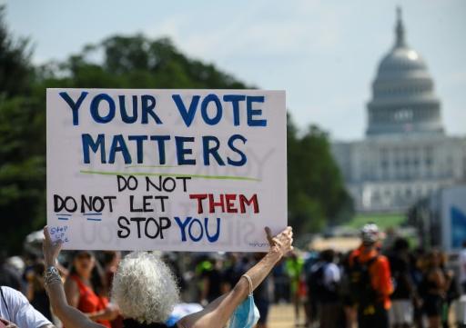 ورفع المتظاهرون في واشنطن الذين ساروا من محيط البيت الأبيض إلى سفح هضبة الكابيتول مبنى الكونغرس في أجواء من الحر والرطوبة، لافتات كتب عليها “حقوق التصويت للجميع” و”التصويت مقدس”.